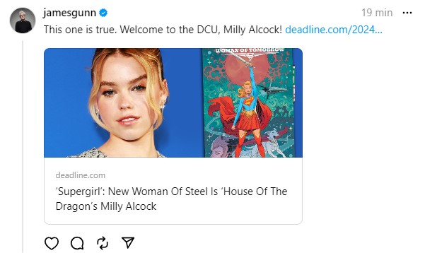 A notícia foi confirmada pelo site Deadline, que informou que Alcock está em negociações para viver Kara Zor-El / Supergirl na próxima franquia DC Universe, que vai trazer uma nova visão dos heróis da editora. Alcock fará sua estreia como Supergirl no filme Superman: Legacy, que será escrito e dirigido por Gunn, e que deve começar a ser produzido ainda nesta primavera. O cineasta confirmou em sua conta no Threads:
