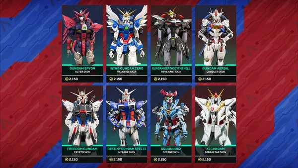 O evento Gundam Apex Legends também traz oito skins jogáveis, transformando lendas do jogo em versões inspiradas em Mobile Suits clássicos: