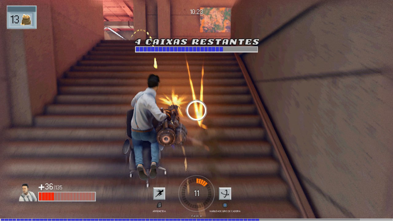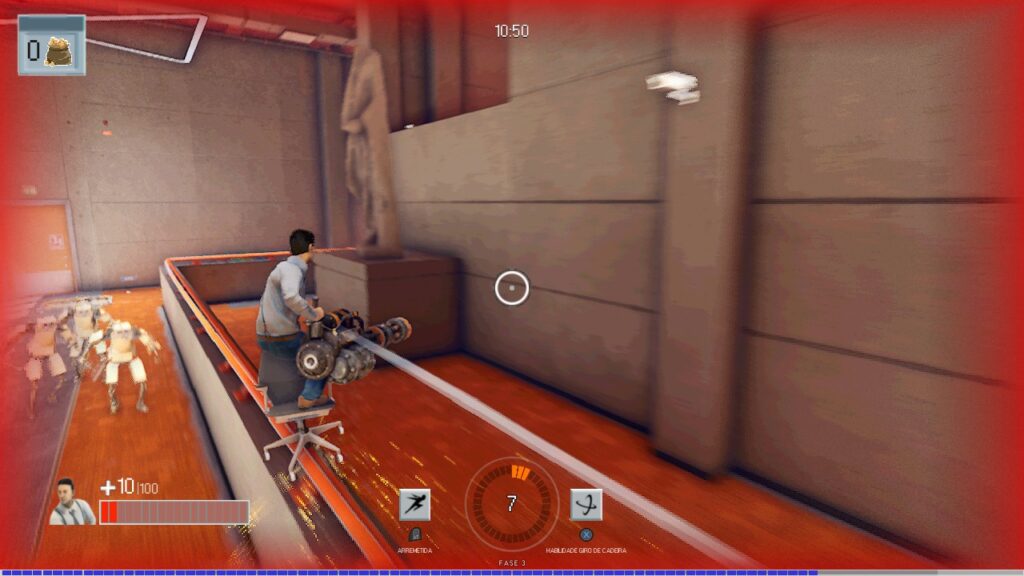 Sim, você leu certo. Cada tiro empurra sua cadeira para trás, para os lados ou para cima, dependendo da arma. Isso transforma até o movimento mais simples em uma dança caótica entre precisão e descontrole. Dominar essa física é essencial, e quando você finalmente pega o jeito, o jogo se torna incrivelmente satisfatório.