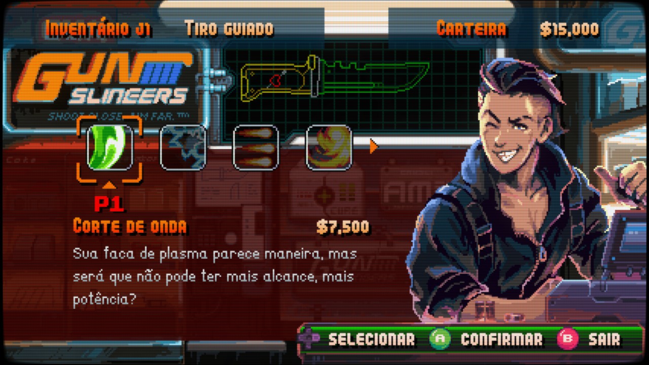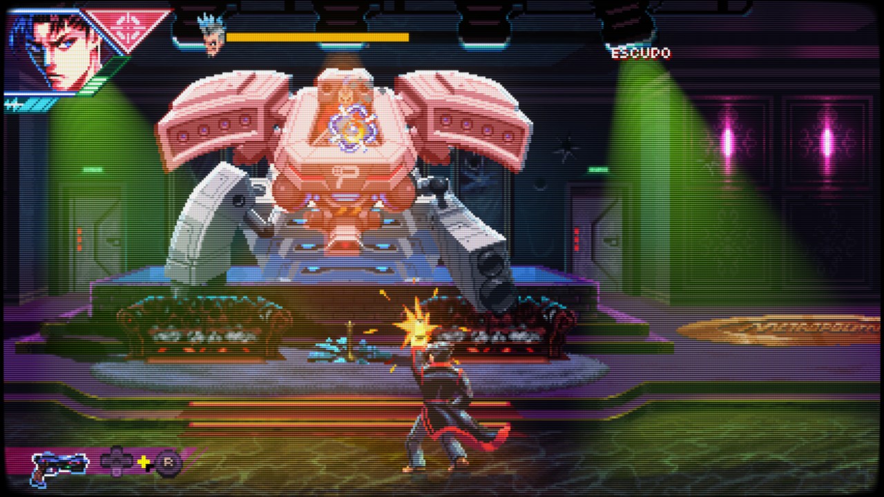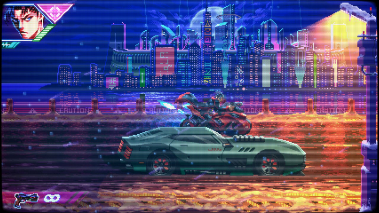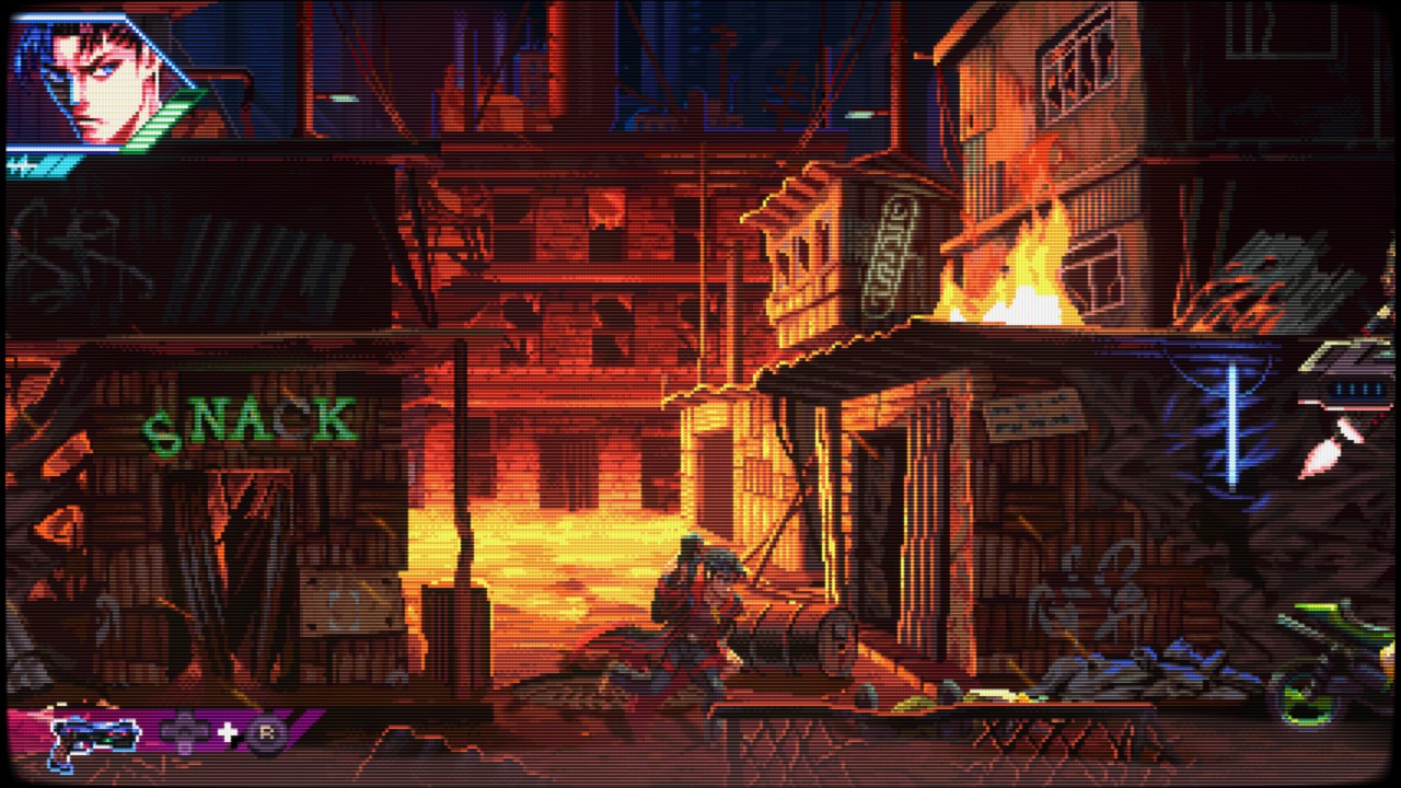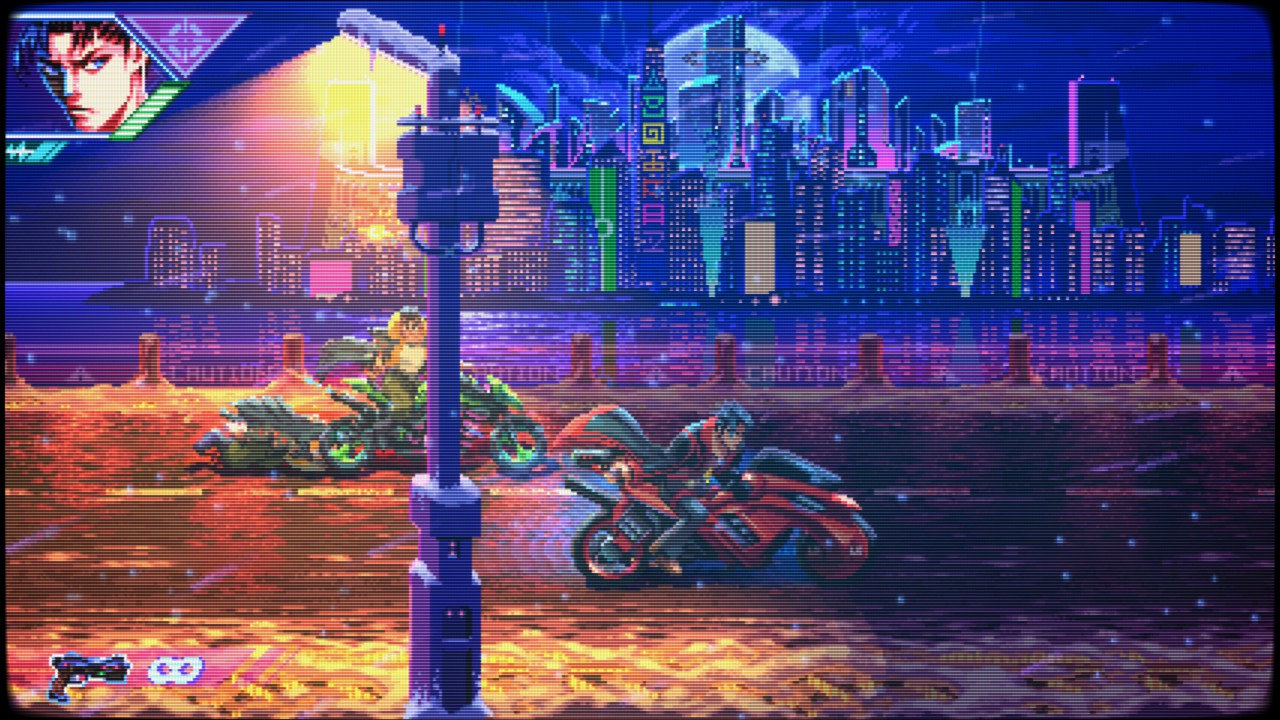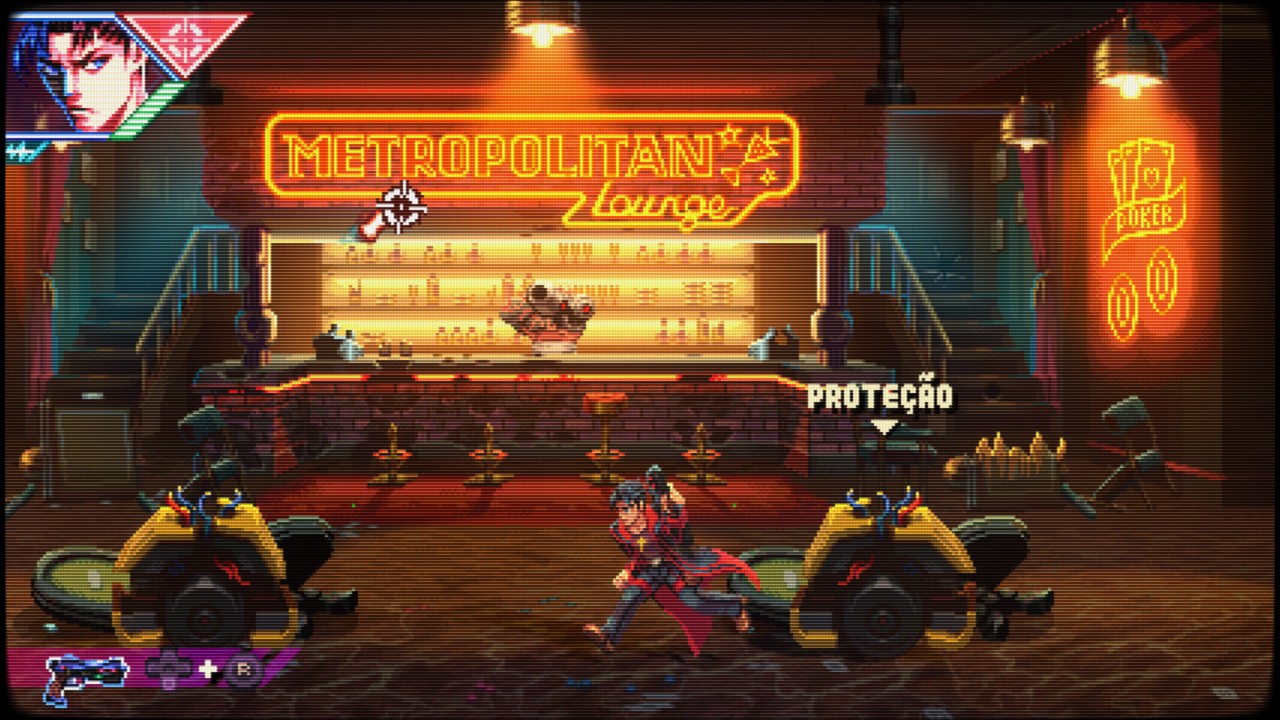 Neon Inferno é um verdadeiro tributo aos clássicos dos anos 90, como Contra, Wild Guns e Sunset Riders. A jogabilidade é frenética, exigente e recompensadora. O estilo run ‘n’ gun domina, com o jogador correndo da esquerda para a direita enquanto elimina ondas de inimigos. Mas há mais: o jogo incorpora elementos de beat ‘em up, permitindo ataques corpo a corpo, combos e até parry de projéteis — uma mecânica que adiciona profundidade e estratégia ao combate.