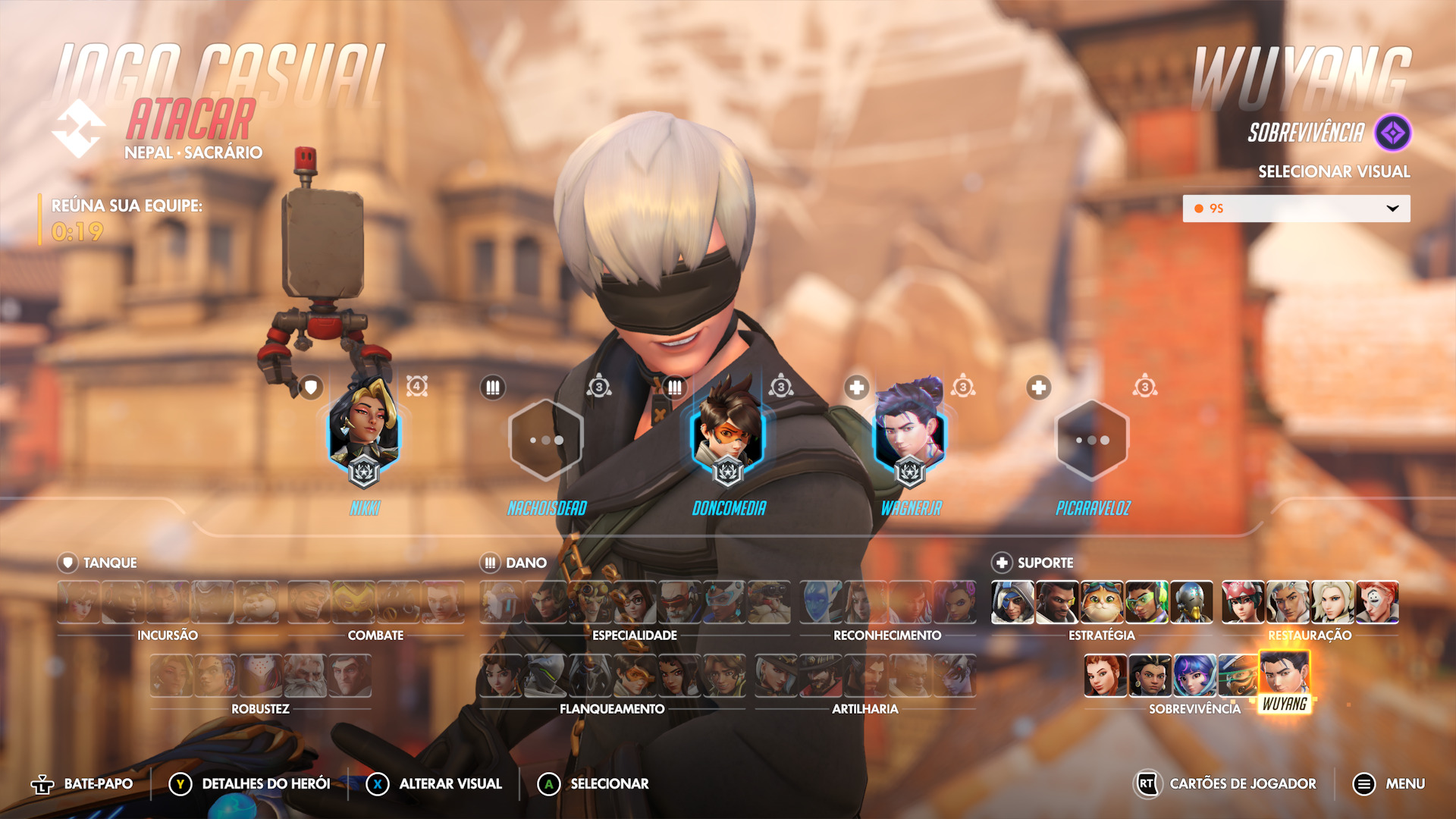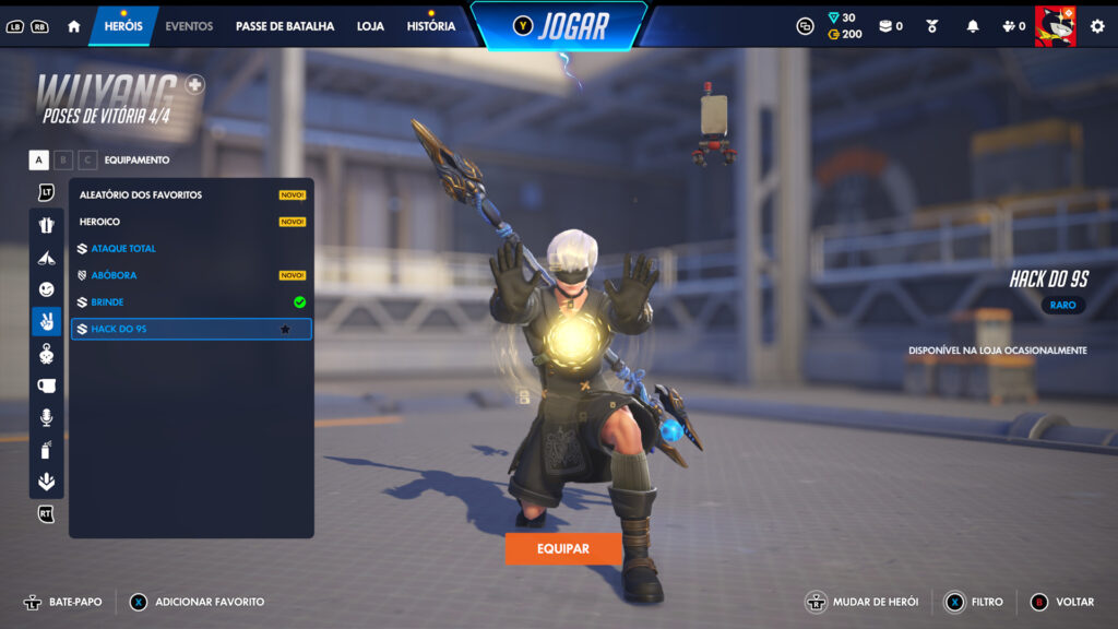Wuyang assume o papel de 9S, o androide tático e analítico de NieR: Automata. A skin traz o visual característico do personagem: roupas escuras, detalhes prateados, luvas e a venda que esconde os olhos.