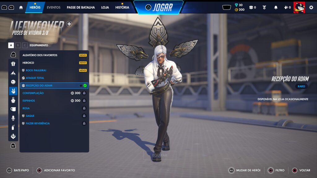 Por fim, temos Lifeweaver como Adam, o humanoide enigmático de NieR: Automata. A skin combina perfeitamente com o estilo do herói: elegante, misteriosa e com um toque de superioridade estética.