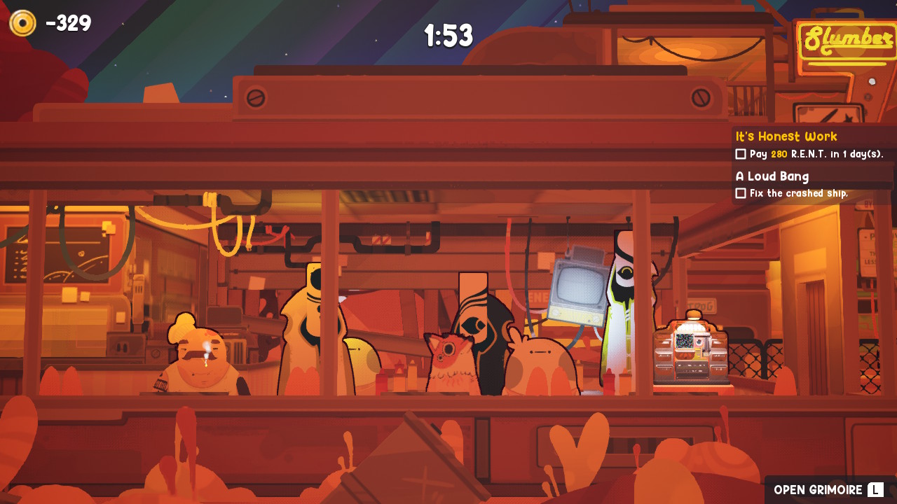 A ambientação de Uncle Chop’s Rocket Shop é um dos seus pontos mais fortes. O jogo se passa em uma galáxia excêntrica e cheia de personagens bizarros, com elementos que remetem à ficção científica pulp e um toque de humor ácido. A estação de serviço, onde Wilbur trabalha incansavelmente, é um ambiente decadente e cheio de detalhes, com máquinas barulhentas, ferramentas espalhadas e uma atmosfera de trabalho árduo.