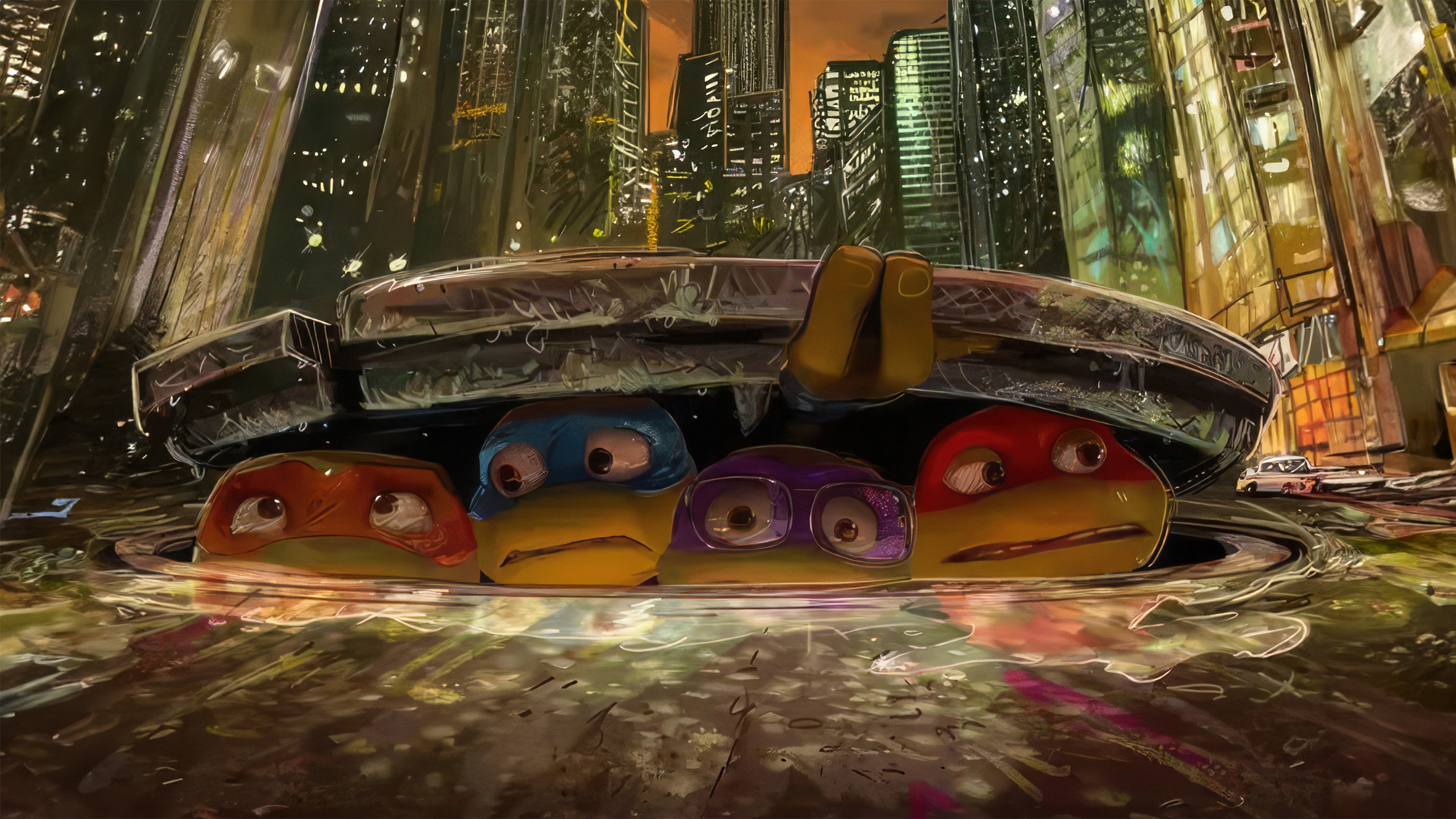 Entretanto, o maior acerto está nas escolhas visuais do filme e em sua estética. O trabalho remete bastante a animações recentes como Arcane, Homem-Aranha: Através do Aranhaverso e Gato de Botas: O Último Desejo, mesclando o uso de 2D com 3D na modelagem de seus personagens e experimentando escolhas ousadas em cenários e paleta de cores. Aqui, esse estilo de animação ousa mais uma vez. A modelagem dos personagens é menos realista em suas formas e feições enquanto os cenários buscam uma inspiração no grafite para compor Nova York, os esgotos e os demais cenários que surgem ao longo do filme. Existem quebras de padrões durante as cenas, experimentações visuais que trazem um ar mais sujo, urbano e caótico para aquele mundo. As sequências de ação possuem uma fluidez ímpar e preenchem os cenários vivos que também sofrem as consequências da ação. Nesses pontos vemos os acertos também da edição do filme que traz uma lógica mais live action de composição de cenas.