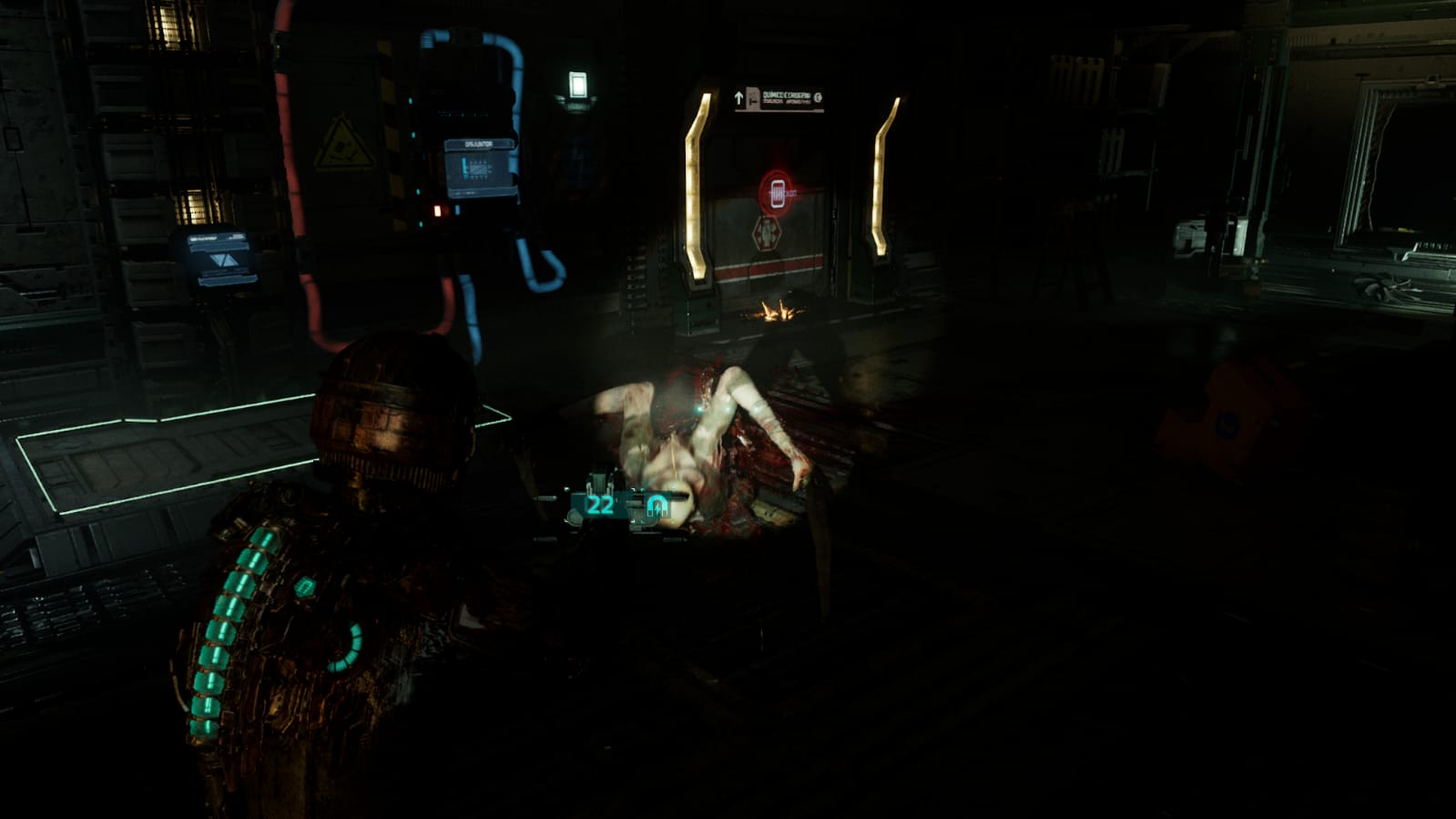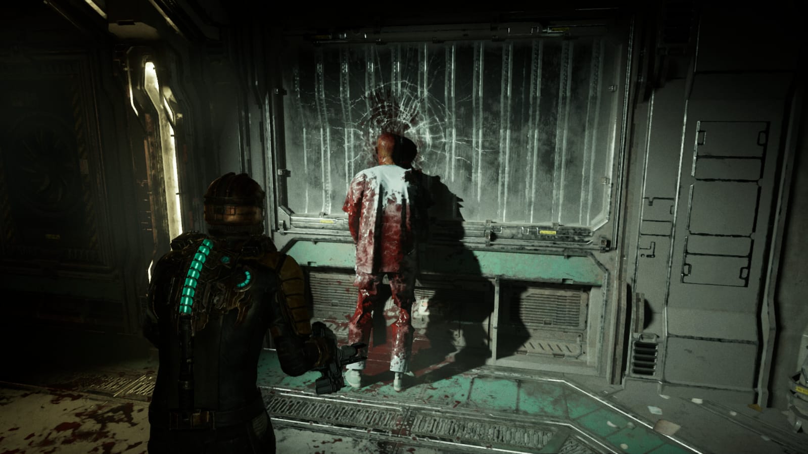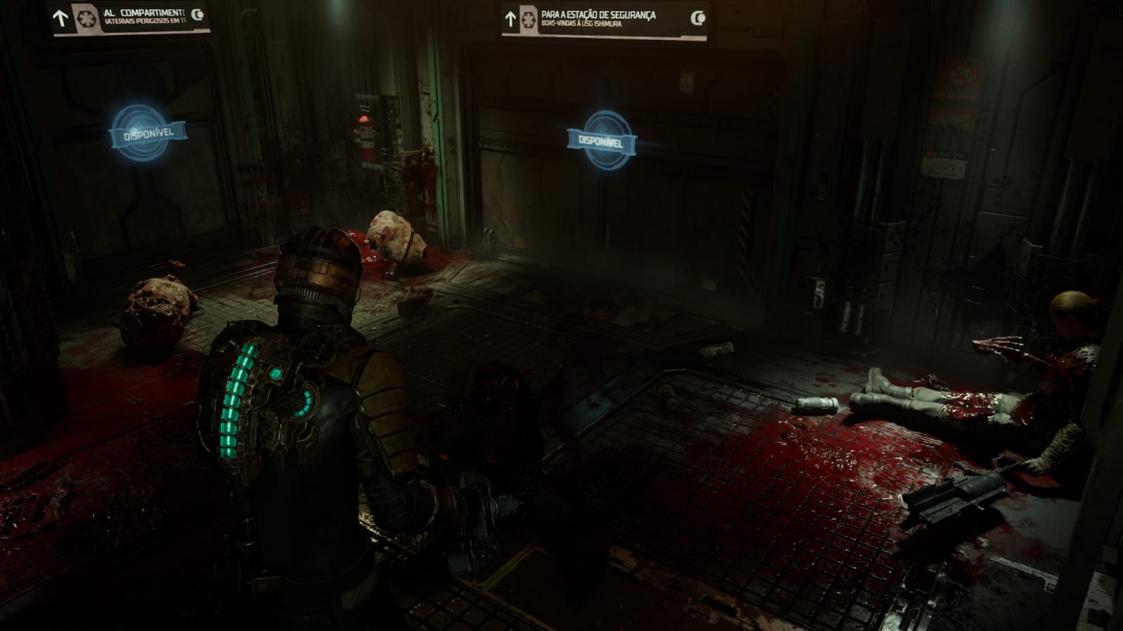 A mais pura essência do verdadeiro horror está presente aqui… Dead Space (2023) oferece lições magistrais quando se trata de criar uma ambientação aterrorizante. Corpos mutilados estão por todos os lados, escrituras em sangue nas paredes, restos de mucosa humana, e aqueles que ainda não morreram enlouqueceram ou tiraram a própria vida na frente de Isaac.